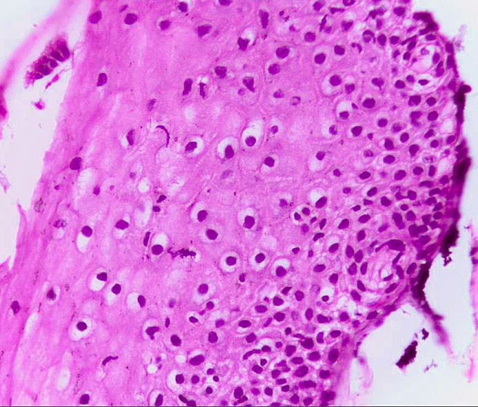 It is usually detected by pap smear that will show koilocytes, which are cells with clear halo surrounding hyperchromatic, atypical nuclei that begin at the basal layer and extend outward.