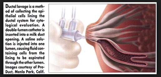 A biopsy should be performed in order to rule out breast cancer. In the case of intraductal papilloma, ductal lavage by microcatheter is the preferred way to test for abnormal intraductal cells because it is more accurate than examining nipple fluid aspirate.