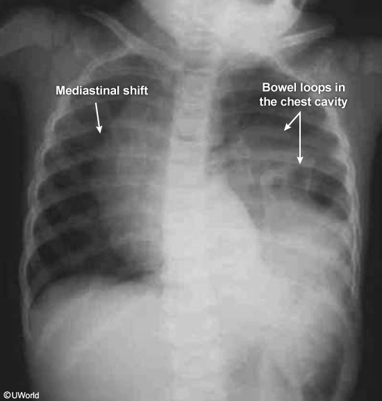 Elevation of the hemidiaphragm on the chest x-ray might be the only abnormal finding, but ultrasonography or CT scan of the chest is sometimes required if the chest x-ray does not visualize the area well. The small bowel is sometimes present in the thoracic cavity.
