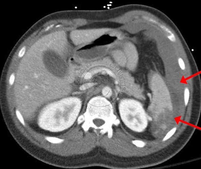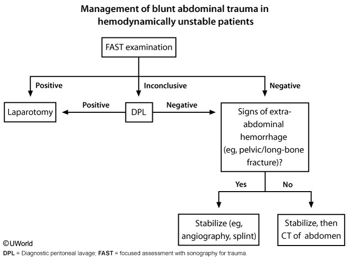Focused abdominal sonography for trauma (FAST) scan can be used to evaluate potential areas of blood collection within the peritoneum. It should be the first step in alert and hemodynamically stable (eg, systolic blood pressure >90 mm Hg) patients. If FAST is limited or equivocal, a diagnostic peritoneal lavage (DPL) can be done to evaluate for hemoperitoneum, but only for blunt and not penetrating trauma. Hemodynamically unstable patients with a positive finding on either DPL or FAST should undergo exploratory laparotomy. Hemodynamically stable but altered should undergo CT.