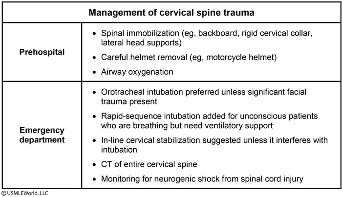 Neck hyperextension in patients with possible cervical spine injury should be avoided; in-line stabilization and/or fiberoptic intubation should be used when intubating.