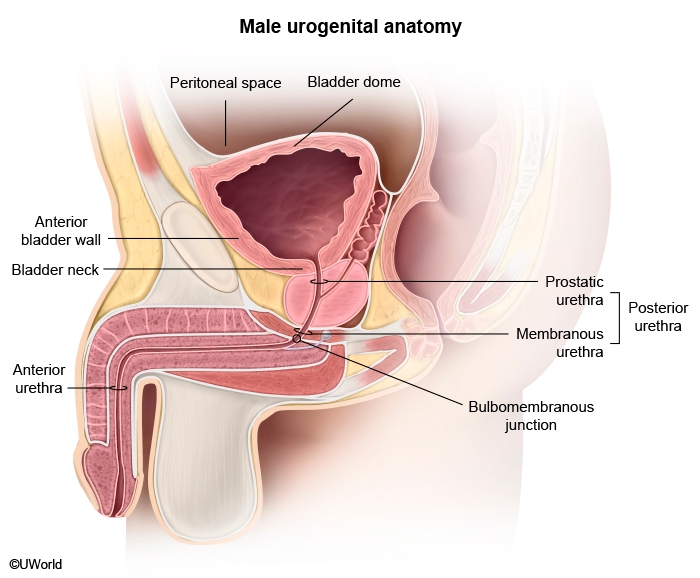 The bulbomembranous junction (junction of the anterior and posterior urethra) is the most common site of urethral injury. However, the urethra is an extraperitoneal structure, so its injury does not lead to peritonitis. In posterior urethral injury (eg, membranous urethral injury) and bulbomembranous transection, digital rectal examination may reveal a high-riding prostate. In the case of anterior urethral injury, penile trauma (eg, laceration, contusion) is often visible.