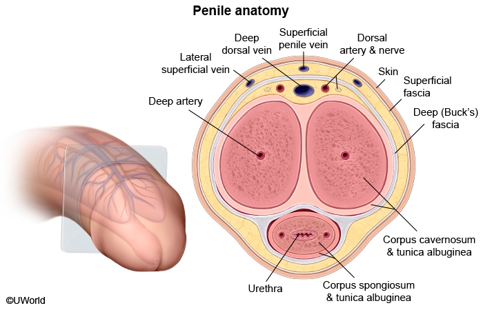 This patient has a classic presentation of penile fracture (PF), which results from the rupture of the corpus cavernosum due to a traumatic tear in the tunica albuginea (which envelopes the corpus cavernosum). PF is most frequently encountered when the penis is in the erect state. Patients typically experience an audible snapping sensation, detumescence, and minimal to severe pain (depending on severity of the injury); a hematoma forms rapidly, causing bending of the shaft of the penis at the fracture site.