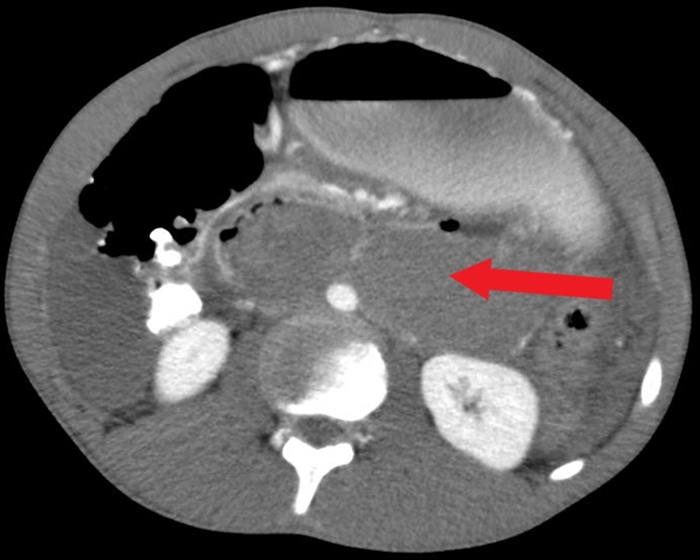 Patients with DH due to BAT may initially have only symptoms of abdominal wall trauma, which may improve before subsequent clinical deterioration as the DH expands. Patients classically present 24-36 hours after the initial event with epigastric pain and vomiting due to failure to pass gastric contents beyond the obstructing hematoma. Diagnosis is confirmed with CT imaging of the abdomen.