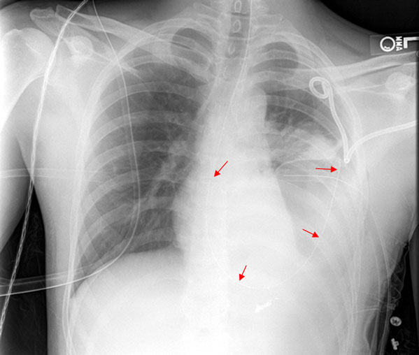 Myocardial contusion may also result from blunt trauma. Tachycardia is a common sign, and chest x-ray may demonstrate rib fractures, a common cause of cardiac contusion. Other symptoms include new bundle branch blocks or arrhythmia. Sternal fracture is a commonly associated finding. Mediastinal widening is not seen with myocardial contusion alone. Can have increased PCWP with infusion of saline suggesting left ventricular dysfunction.