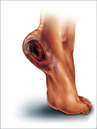 Decubitus ulcer (also known as a pressure ulcer) describes a localized ulceration, which typically develops over a bony prominence (e.g. sacrum, heel) from unrelieved pressure (i.e. hospital bed or wheelchair confinement).