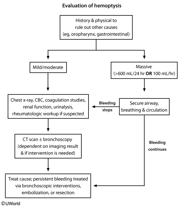massive bleeding: This patient has an episode of massive hemoptysis, defined as >600 mL of expectorated blood over a 24-hour period or a bleeding rate >100 mL/hour. The greatest danger in massive hemoptysis is not exsanguination but asphyxiation due to the airway flooding with blood. Initial management involves establishing an adequate patent airway, maintaining adequate ventilation and gas exchange, and ensuring hemodynamic stability. The patient should be placed with the bleeding lung in the dependent position (lateral position) to avoid blood collection in the airways of the opposite lung.