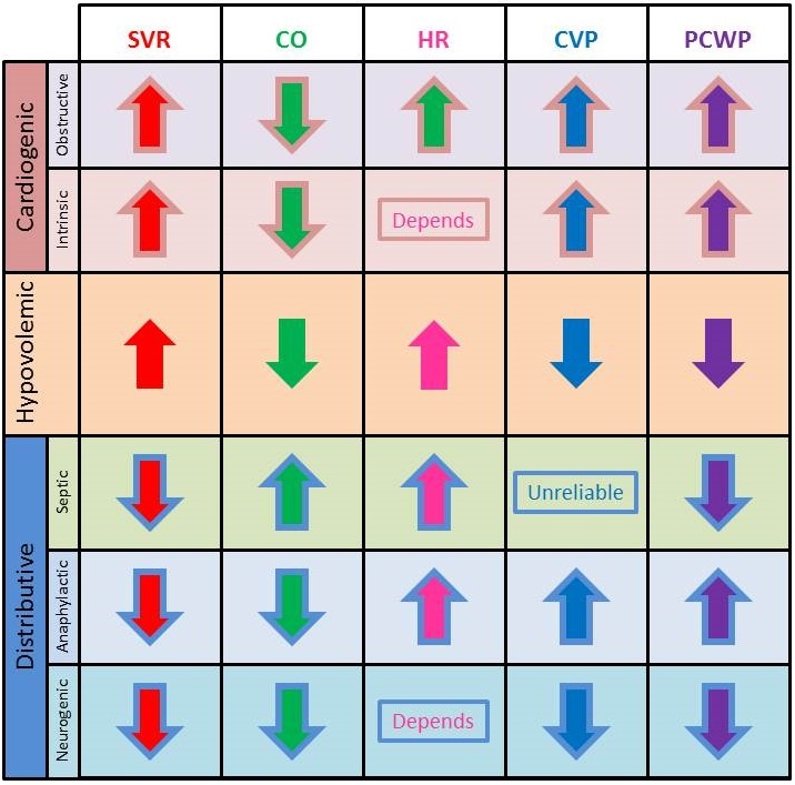 The type of shock can often be discerned if certain physiological parameters are known, as demonstrated in the accompanying table. This is a frequently tested concept.