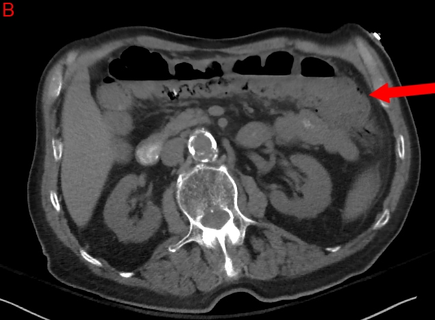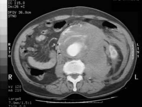 The symptoms and signs can also mimic other abdominal pathologies, such as renal colic, mesenteric ischemia, pancreatitis, diverticulitis, and biliary disease. This patient's acute onset of symptoms, age, and profound hypotension suggest ruptured AAA, which must be ruled out before the other etiologies. He should be immediately taken to the operating room for emergent surgical repair of the ruptured AAA. Mortality with this condition is approximately 50%, so early recognition and operative intervention is essential.