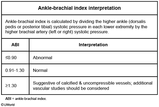 Patients with an ABI > 1.3 have noncompressible vessels indicative of severe arterial disease from calcified arteries. This is often seen in patients with diabetes and concomitant medial artery calcification.
