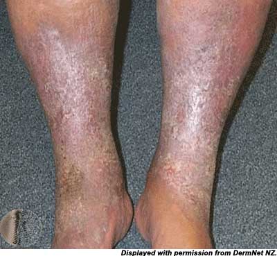 Venous stasis dermatitis - deposition of hemosiderin leading to hyperpigmentation