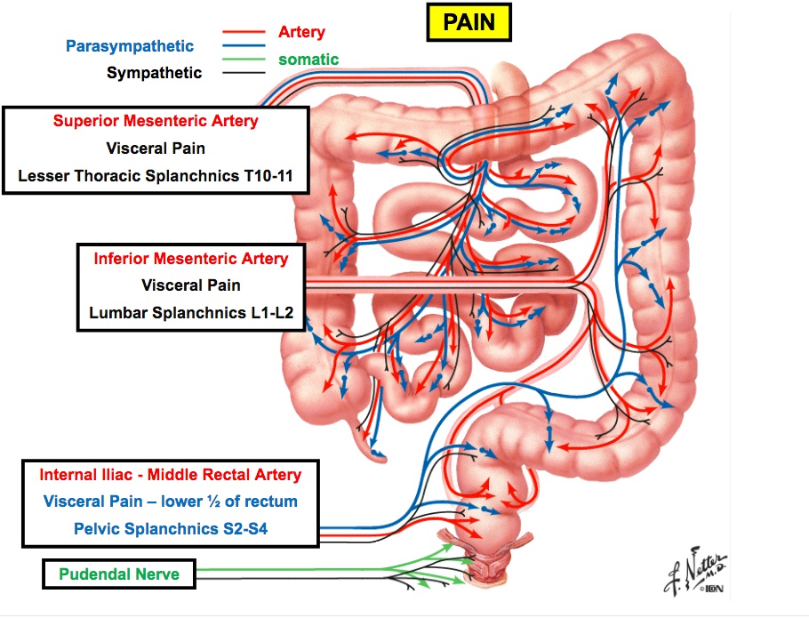 rectum: retroperitoneal, parasympathetic pain.