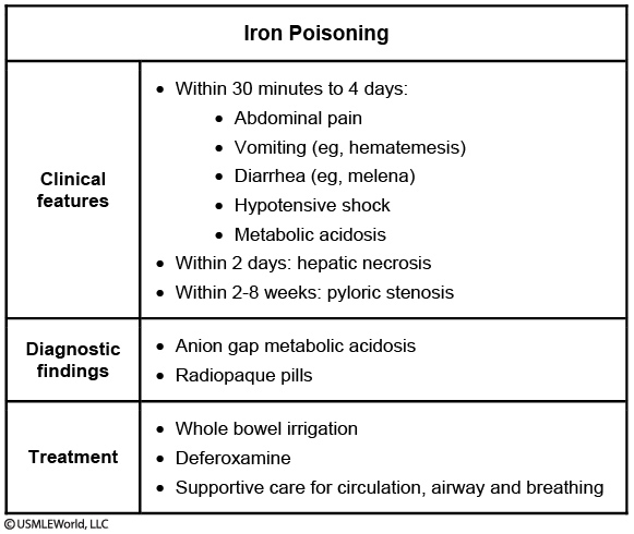 The diagnosis is confirmed by measuring serum iron levels. Iron is radiopaque, and visualization of gastric tablets on abdominal x-ray further supports the diagnosis. Treatment depends on the severity of the poisoning. Whole-bowel irrigation is sometimes instituted, but other methods of decontamination (eg, activated charcoal, syrup of ipecac, gastric lavage) are not routinely recommended. Chelation therapy with intravenous deferoxamine is used in moderate-to-severe cases and would be indicated in this patient.