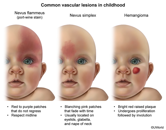 Neurofibromatosis type 1 (NF1) is an autosomal dominant neurocutaneous syndrome. Café-au-lait macules are the earliest manifestations. Numerous macules can appear as early as infancy. With increasing age, axillary/inguinal freckles, Lisch nodules (iris hamartomas), and neurofibromas (benign peripheral nerve sheath tumors) become significant. Patients with NF1 are also at risk for developing intracranial neoplasms. Optic pathway glioma is the most common type of intracranial lesion and typically manifests during toddlerhood.