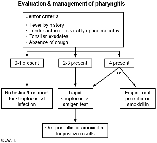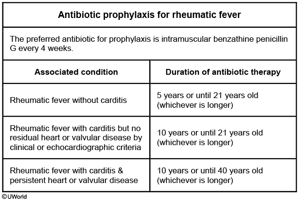 Patients with a history of rheumatic fever are at high risk for recurrence and progression of rheumatic heart disease with repeated episodes of GAS pharyngitis. All such patients should receive continuous antibiotic prophylaxis to prevent recurrent GAS pharyngitis. The preferred regimen is administration of intramuscular benzathine penicillin G every 4 weeks. The total duration of antibiotic prophylaxis depends on the severity of the disease (Table).
