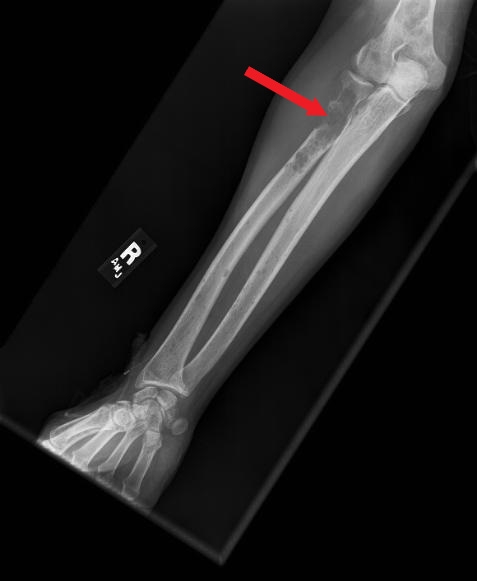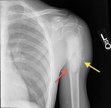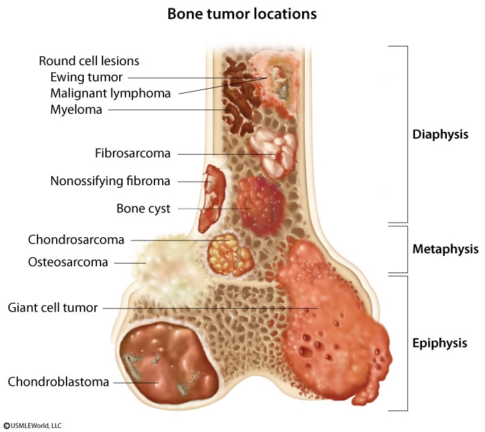 Imaging of Ewing sarcoma classically reveals a lamellated periosteal reaction in which a central, poorly defined lytic lesion is surrounded by concentric layers of new bone ("onion skinning"). A "moth-eaten" or mottled appearance can also occur with extension into soft tissue. Codman triangle is a nonspecific radiographic finding that represents the displacement/elevation of periosteum by underlying tumor and can also be seen in osteosarcoma. Treatment includes chemotherapy as well as surgical resection ± radiation.