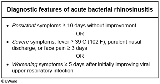 The duration of this patient's symptoms is consistent with acute bacterial rhinosinusitis. Streptococcus pneumoniae (30%), nontypeable Haemophilus influenzae (30%), and Moraxella catarrhalis (10%) are the most commonly implicated organisms. Due to increasing rates of beta-lactamase resistance, the treatment of choice is amoxicillin-clavulanic acid. Patients with asthma may experience exacerbations (eg, wheezing, coughing) triggered by concurrent upper respiratory infection.