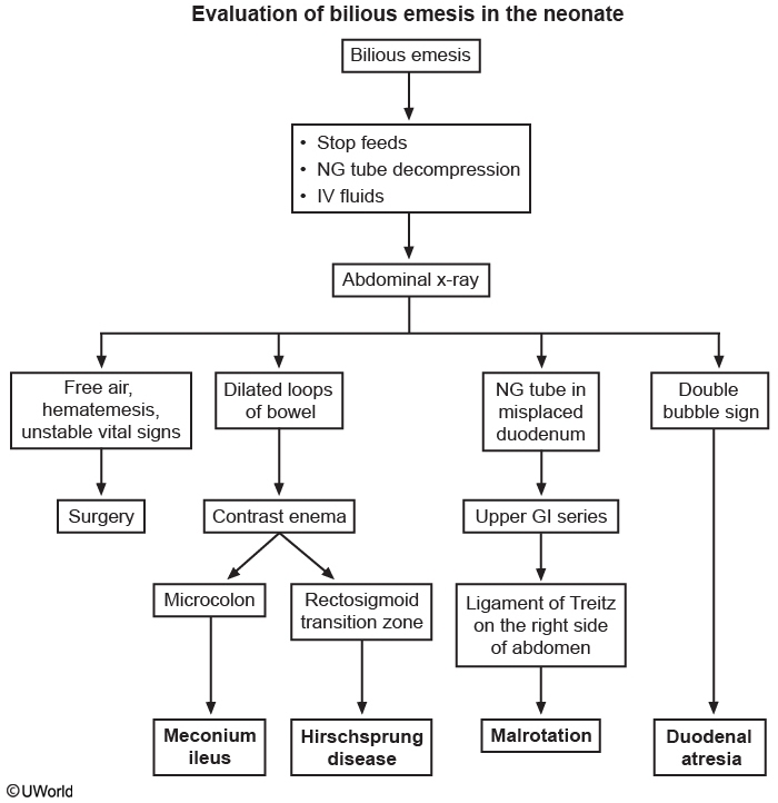 The finding of the Ligament of Treitz on the right side of the abdomen reflects malrotation while contrast in a "corkscrew" pattern indicates volvulus.