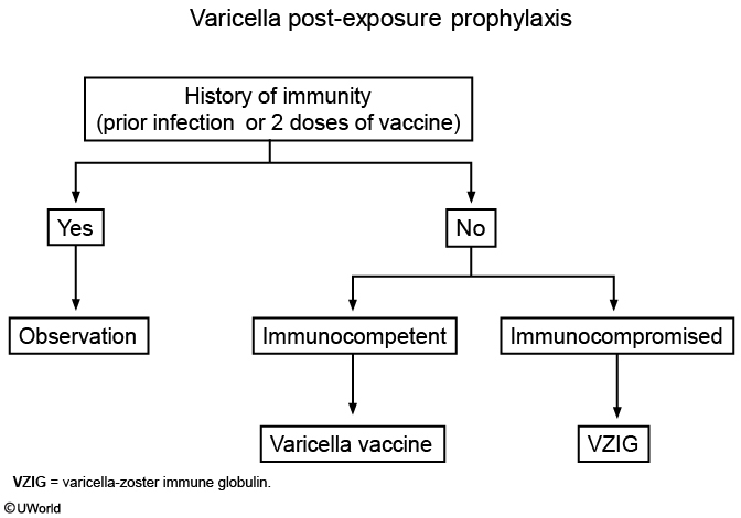 Immunity to varicella is acquired by prior infection or by receiving 2 doses of VZV vaccine (at ages 1 and 4 years). Postexposure prophylaxis with VZV vaccine is indicated for this incompletely immunized child age >1 year who was exposed within the preceding 5 days. For susceptible individuals who cannot receive live-virus vaccines (eg, immunocompromised or pregnant patients), postexposure prophylaxis can be provided using varicella immunoglobulin. Infants (age <1 year) outside the neonatal period are not eligible for VZV vaccine and do not require immunoglobulin as they are at lower risk than neonates or older children.