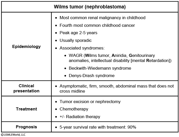 Abdominal ultrasonography should be the first step in imaging to differentiate Wilms tumor from other causes of abdominal masses. It should be followed by contrast-enhanced computed tomography of the abdomen to evaluate the nature and extent of the mass and of the chest to identify any pulmonary metastases. Treatment includes surgery and chemotherapy with the addition of radiation therapy for high-stage disease. Survival rates are excellent especially if treated in the early stages.