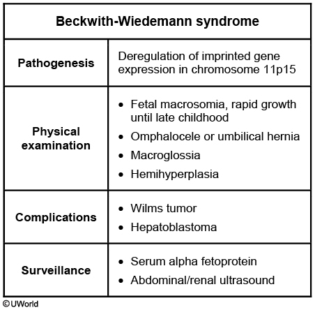 Beckwith-Wiedemann syndrome (BWS) is an overgrowth disorder characterized by a predisposition to neoplasms. Most patients have a sporadic or inherited alteration of chromosome 11p15, which includes genes that encode insulin-like growth factor 2, a growth-promoting hormone similar to insulin. At birth, classic physical findings include macrosomia, macroglossia, hemihyperplasia, and medial abdominal wall defects (umbilical hernia, omphalocele). Some infants also have visceromegaly.