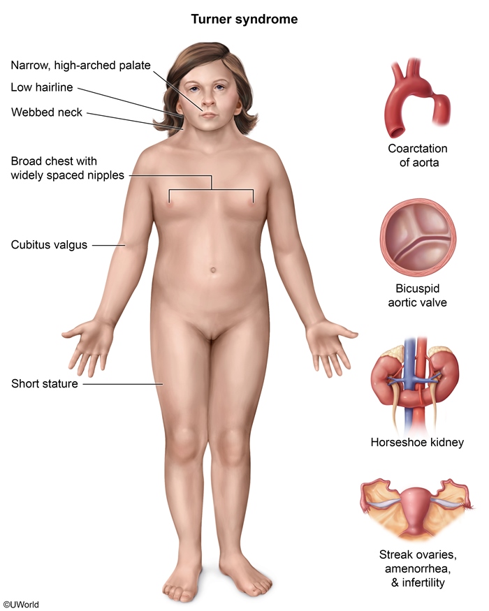 Patients with TS typically have ovarian dysgenesis, leading to "streak ovaries" (small ovaries with little to no follicles) and primary ovarian insufficiency. Because ovaries normally produce estrogen, patients with TS are estrogen deficient, which leads to amenorrhea and minimal or no breast development (thelarche). Estrogen also inhibits osteoclast-mediated bone resorption; therefore, patients with TS have increased bone resorption, decreased bone mineral density, and increased risk of osteoporotic fracture. Estrogen replacement therapy is given to girls with TS to promote normal sexual maturation and reduce the risk of osteoporotic fractures.
