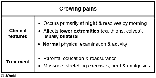 Growing pains are a common musculoskeletal complaint in children, occurring in approximately 10%-30% of children age 2-12 years. The etiology of growing pains is unknown, but they are unrelated to growth, despite their name. The diagnosis of growing pains can be made clinically (Table) in the absence of systemic symptoms and abnormal examination findings. Laboratory studies and radiographs are not necessary.
