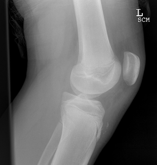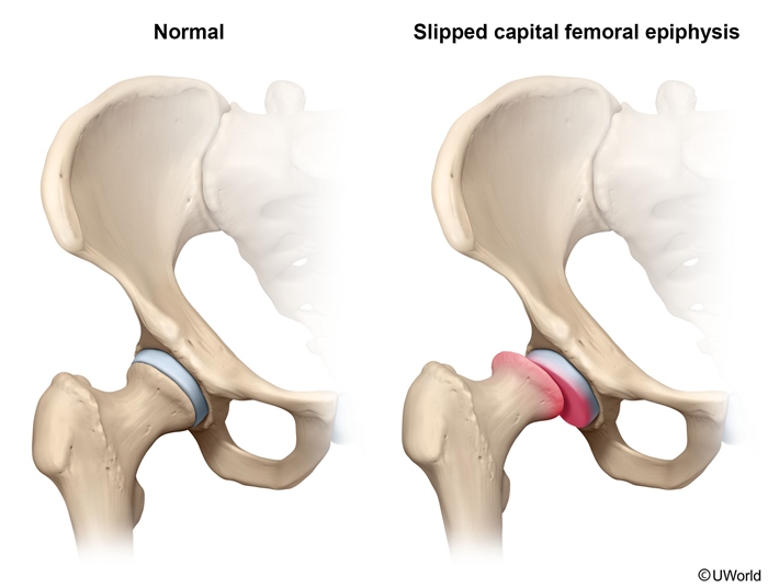 This patient has slipped capital femoral epiphysis (SCFE), displacement of the capital femoral epiphysis from the femoral neck. This typically presents in obese children age 10-16 years. Adolescent boys are affected slightly more often than girls. Additional risk factors include endocrinopathies (eg, hypothyroidism, growth hormone deficiency), renal failure, and radiation history. Children with endocrinopathies almost always have bilateral disease and present at an earlier age. Patients classically present with an insidious onset of dull hip or referred knee pain and altered gait with no preceding trauma. Minor trauma, as in this patient, can sometimes exacerbate the pain and bring the patient to medical attention. On examination, patients tend to hold the affected hip in passive external rotation and exhibit decreased internal rotation, abduction, and flexion. Diagnosis is made with plain radiographs of the hip (anteroposterior and frog-leg lateral views), which show the posteriorly and inferiorly displaced femoral head. Both hips should be imaged for comparison and to assess for contralateral displacement. The gold standard treatment is immediate surgical screw fixation at the current degree of slippage to avoid the risk of avascular necrosis (AVN).