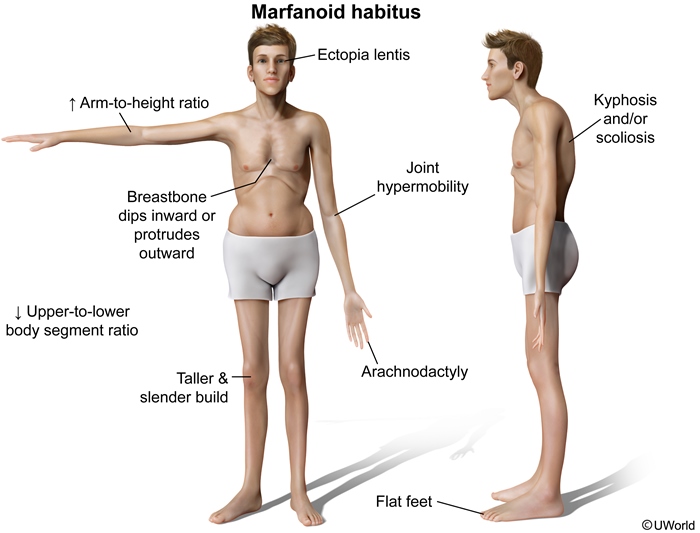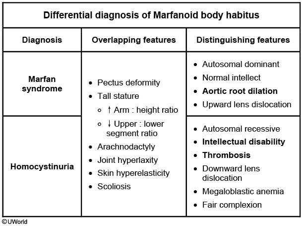 Homocystinuria is an autosomal recessive disorder that results from deficiency of cystathionine synthase, an enzyme involved in the metabolism of methionine. These patients share many features of Marfan syndrome (eg, pectus deformity, tall stature, arachnodactyly). However, they usually have a fair complexion, thromboembolic events, and intellectual disability. The other main differentiating feature is lens dislocation in homocystinuria that is downward rather than upward.