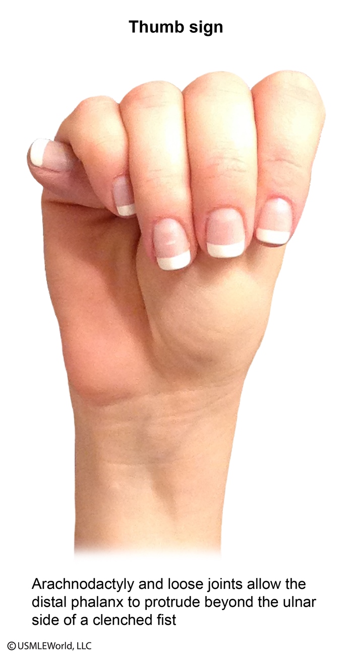 This patient's family history and physical appearance are very characteristic of Marfan syndrome. Marfan syndrome is an autosomal dominant disorder of the fibrillin-1 gene that results in systemic weakening of connective tissue. Classic skeletal manifestations include joint hypermobility, skin hyperelasticity, long fingers (arachnodactyly ["thumb sign"]), pectus excavatum, and scoliosis/kyphosis. The face is long, the palate has a high arch, and the teeth are crowded. Lens dislocation (ectopia lentis), iridodonesis (a rapid contraction and dilation of the iris), and myopia (from elongation of the globe) are also typical.