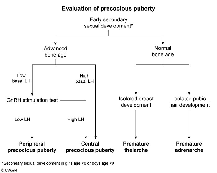 This child has early breast and pubic hair development consistent with precocious puberty, the onset of secondary sexual characteristics in girls age <8 or boys age <9. Central precocious puberty is due to early activation of the hypothalamic-pituitary-gonadal axis. Peripheral precocity is attributed to premature secretion of sex hormones independent of GnRH.