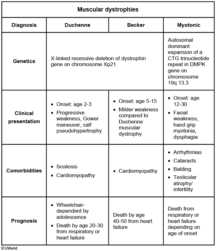 Myotonia (delayed muscle relaxation) is most notable when the patient is unable to release the hand after a handshake (grip myotonia). Skeletal muscle weakness is prominent in the face, forearms, hands, and ankle dorsiflexors (eg, bilateral foot drop). Dysphagia, the most dangerous smooth muscle manifestation, significantly increases the risk of aspiration pneumonia. Cardiac involvement includes conduction problems and arrhythmias. Other manifestations include cataracts, testicular atrophy/infertility, frontal baldness, and insulin resistance.