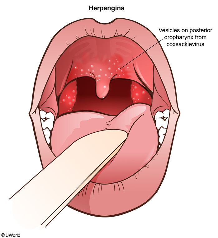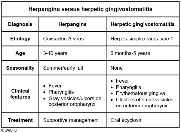 The primary distinguishing feature between these illnesses is the location of the lesions. Herpangina typically presents with 1-mm gray vesicles on the tonsillar pillars and posterior oropharynx that progress to fibrin-coated ulcerations. It can be accompanied by lesions on the hands and feet (ie, hand-foot-mouth syndrome). In contrast, the vesicles in HSV gingivostomatitis (Choice D) generally localize to the anterior oropharynx and lips.