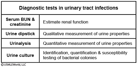 Serum blood urea nitrogen (BUN) and creatinine and urinalysis are quick, noninvasive, preliminary tests that should be done in all infants with illnesses involving the urinary tract. The BUN and creatinine provide a general sense of the patient's hydration status and degree of renal impairment. Urine dipsticks are also commonly performed, but they have a high rate of false-positive and negative results. Microscopic urinalysis is more accurate as it provides quantitative data on the degree of inflammation of the urinary tract (eg, number of white blood cells). A urine culture can identify bacteria type and antibiotic susceptibility. Patients who have received multiple antibiotic courses are at risk for resistant organisms.