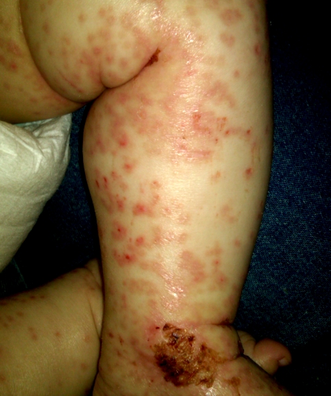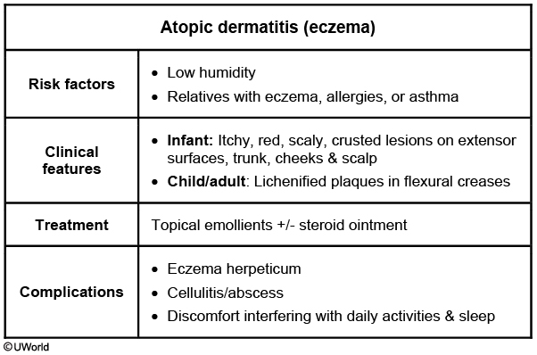 Eczema herpeticum is a complication caused by a superimposed primary herpes simplex virus (HSV) infection (usually type 1). An open area that is exposed to HSV type 1 can develop painful vesicles with an erythematous base that evolve to "punched-out" erosions with hemorrhagic crusting. The lesions can be localized or disseminated, and fever, irritability, and lymphadenopathy are typical. The infection may be life-threatening in infants; systemic acyclovir treatment should be initiated as soon as possible.