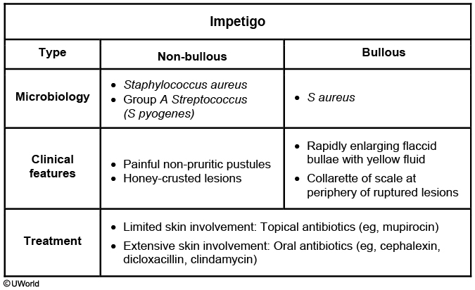 The patient's rash is consistent with localized non-bullous impetigo. Impetigo is a common pediatric rash typically caused by Staphylococcus aureus or group A beta-hemolytic Streptococcus (Streptococcus pyogenes). Predisposing factors include a warm and humid climate, poverty/crowding, poor personal hygiene, and pre-existing skin trauma/inflammation (eg, insect bite, eczema). Colonization with staphylococci or streptococci is also a risk factor.