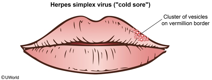Physical examination shows an uncomfortable-appearing child with numerous painful, clear vesicles over erythematous skin on both cheeks as well as a few scattered lesions with overlying dark-red crusting: