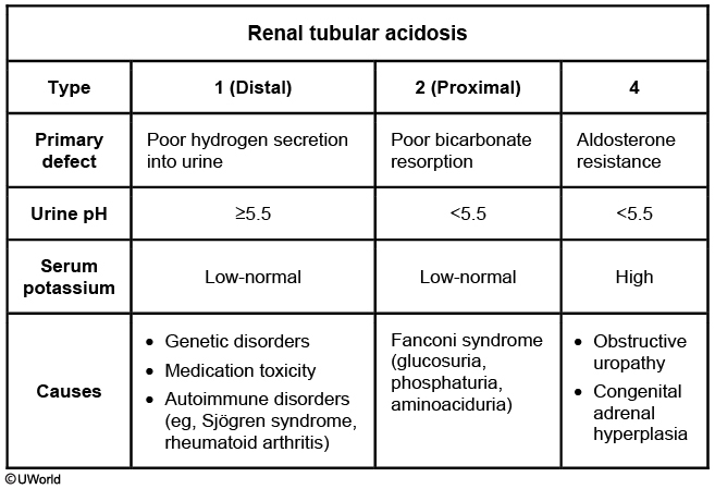 All types of RTA can present as growth failure (due to poor cellular growth and division in acidic conditions). Screening laboratory results will show a low serum bicarbonate level and hyperchloremia, which lead to a normal anion gap metabolic acidosis. Evaluation of urine pH and urine electrolytes can help distinguish between the types of RTA. Given the markedly alkalotic urine in this patient, type 1 RTA is the most likely diagnosis. Treatment consists of oral sodium bicarbonate to normalize the serum bicarbonate levels.