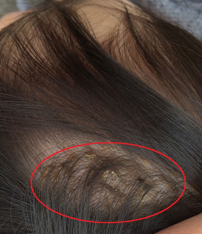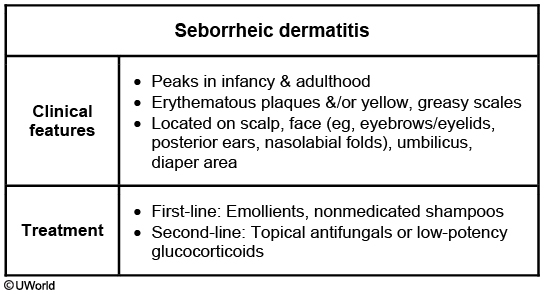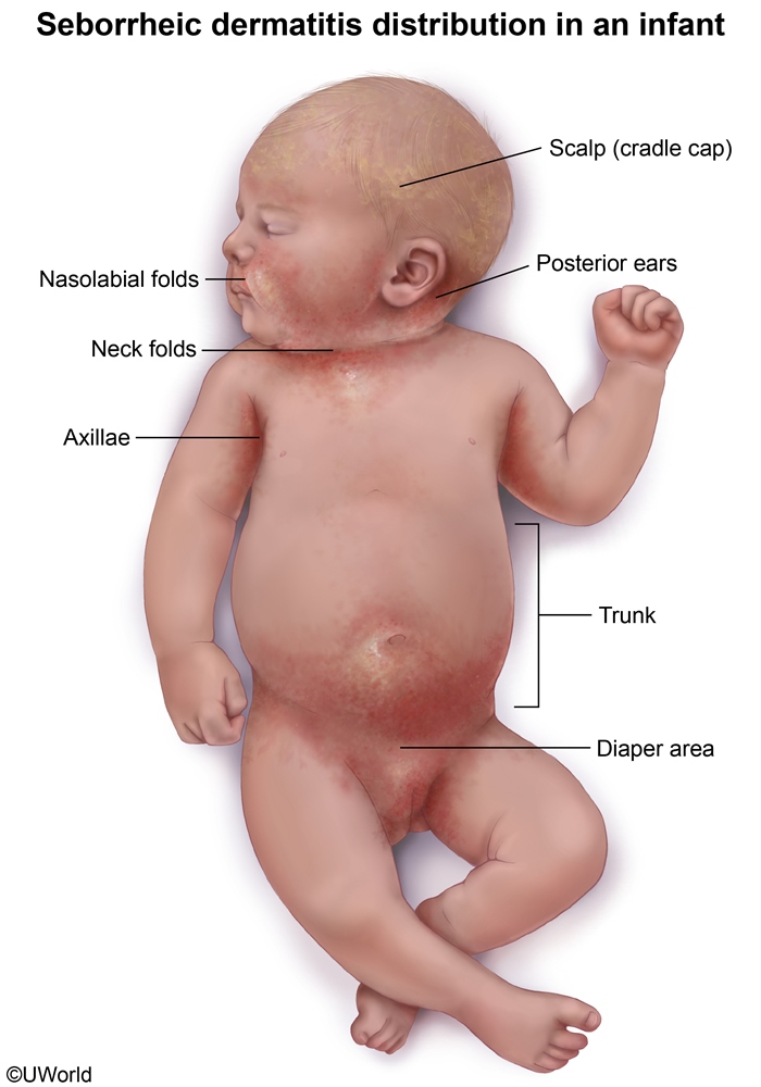 This patient has features typical of seborrheic dermatitis (SD). Incidence of SD peaks in the first year of life and again in adulthood. SD is associated with colonization by Malassezia species and primarily affects areas with numerous sebaceous glands. In infants, these areas include the scalp ("cradle cap") (red circle), eyelids, nasolabial folds, postauricular area, and umbilicus.