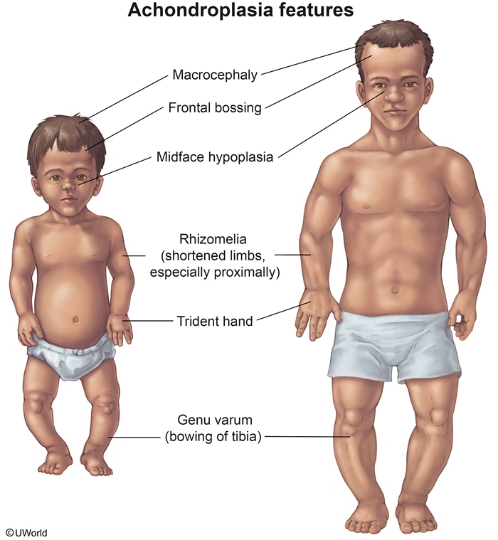 Achondroplasia is caused by a fibroblast growth factor receptor 3 (FGFR3) gene mutation that inhibits endochondral bone formation, primarily in long bones. Therefore, patients have disproportionate short stature (ie, shortening of the extremities relative to the trunk). Common dysmorphic features include frontal bossing and macrocephaly. Fractures and hearing loss are not typical.