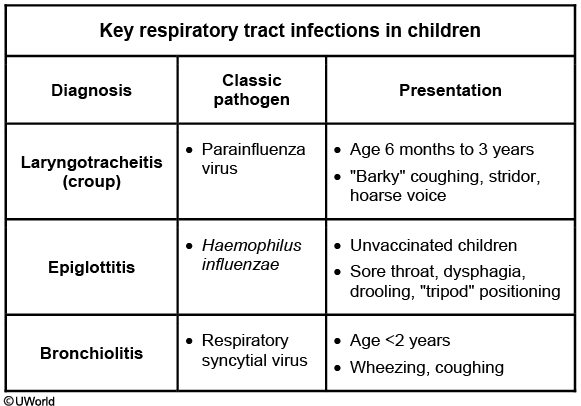 Croup, or laryngotracheitis, is a viral respiratory illness most commonly caused by parainfluenza virus and typically presents in children age 3-36 months. The illness usually begins with nonspecific symptoms (eg, rhinorrhea, congestion, fever); classic croup then presents with a dry, "barky," seal-like cough, hoarseness, and inspiratory stridor due to upper airway obstruction. The stridor worsens with agitation or excitement and may be inspiratory or biphasic (inspiratory and expiratory) in very severe cases.
