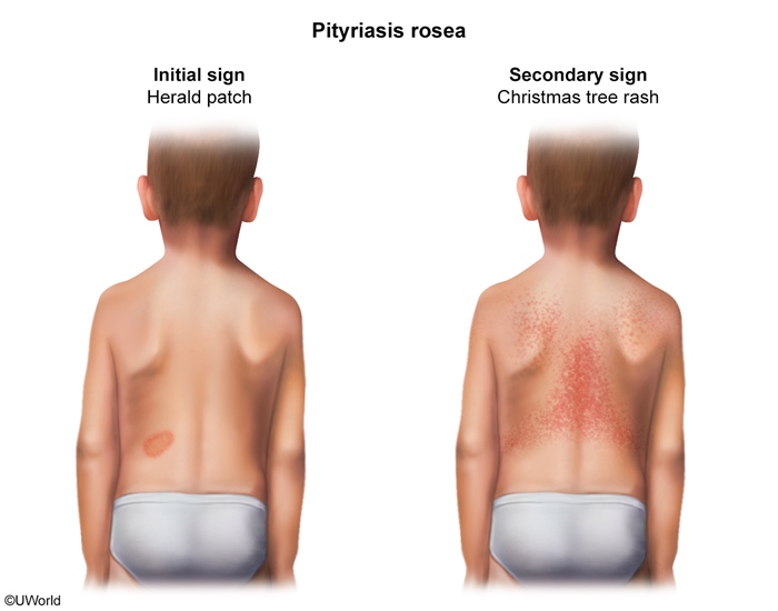 ± Viral prodrome Annular, pink herald patch on trunk Oval lesions in "Christmas tree" pattern Pruritus