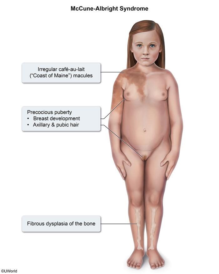 In addition to precocious puberty, this patient has irregular café-au-lait macules confined to one side of the body and recurrent fractures due to polyostotic fibrous dysplasia, characteristic of McCune-Albright syndrome (MAS). MAS is a rare cause of precocious puberty due to a mutation in the GNAS gene, which results in constant G protein activation and overproduction of pituitary hormones. Therefore, in addition to GnRH-independent (ie, peripheral) precocious puberty (FSH, LH), MAS can also lead to thyrotoxicosis (TSH), acromegaly (GH), and Cushing syndrome (ACTH).