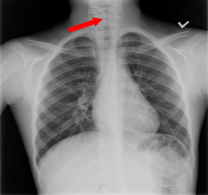 Croup is typically a clinical diagnosis. If the diagnosis is unclear, anteroposterior neck radiographs will reveal subglottic edema known as the "steeple sign" (red arrow). Treatment is aimed at reducing subglottic edema; corticosteroids (eg, dexamethasone) are useful for mild cases and nebulized racemic epinephrine is added for patients with stridor at rest.