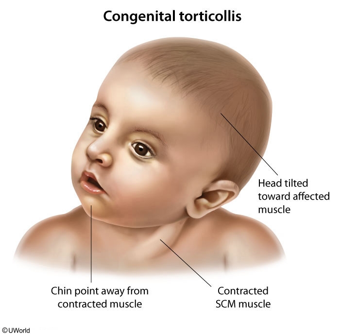Risk factors for CMT are related to crowding in the uterus, such as multiple gestation, breech positioning, and oligohydramnios. Associated conditions, which are also likely related to intrauterine positioning, include developmental dysplasia of the hip, metatarsus adductus, and clubfoot. Treatment strategies include positioning (eg, increased tummy time), passive stretching, and physical therapy. Missed or delayed diagnosis may lead to craniofacial asymmetry. Flattening of the head with ipsilateral anterior displacement of the ear and forehead, known as positional plagiocephaly, is also a common consequence of CMT.