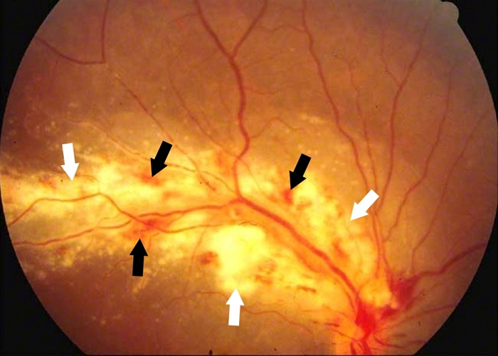 CMV retinitis is characterized by full-thickness retinal inflammation that moves centripetally along the vasculature, causing edema and scarring. Patients experience blurred vision, floaters, and photopsia (sensation of flashing lights). Lesions near the fovea and optic nerve may cause blindness, and scarring greatly increases the risk of retinal detachment. Diagnosis is made by fundoscopyshowing yellow-white, fluffy, hemorrhagic lesions along the vasculature.