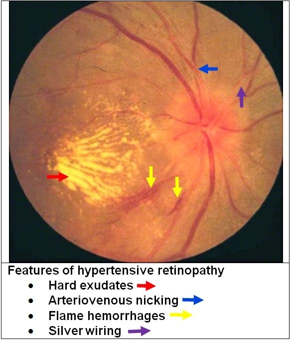 Patients with hypertensive retinopathy typically do not have acute vision loss. On funduscopy, there is focal spasm of arterioles, followed by progressive sclerosis and narrowing. Depending on the severity, arteriovenous nicking, copper or silver wiring, exudates, and/or hemorrhages may be present.