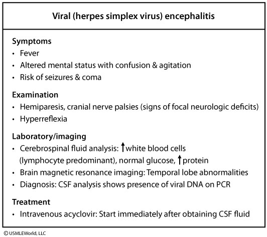 Lumbar puncture usually shows cerebrospinal fluid (CSF) findings of elevated white blood cell count with lymphocytic predominance, normal glucose, and normal to slightly elevated protein concentration (generally 100 mg/dL). Most patients have an increased red blood cell count as well. Diagnosis is usually confirmed by detecting viral DNA by polymerase chain reaction (PCR) in the CSF. Empiric treatment with intravenous acyclovir should be started while awaiting PCR results as encephalitis is often associated with significant morbidity and mortality.