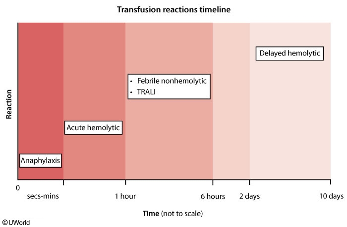 This patient most likely has febrile nonhemolytic transfusion reaction, the most common adverse reaction that occurs within 1-6 hours of transfusion. When red cells and plasma are separated from whole blood, small amounts of residual plasma and/or leukocyte debris may remain in the red cell concentrate. During blood storage, these leukocytes release cytokines, which when transfused can cause transient fevers, chills, and malaise, without hemolysis.