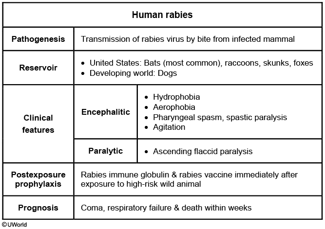 Rabies is a fatal, neurotropic, viral disease transmitted to humans by exposure to saliva from an infected animal through a bite. Hydrophobia and aerophobia are pathognomonic features of encephalitic rabies; the feeling of water or air triggers involuntary pharyngeal muscle spasms. Many patients are disoriented and agitated, with fluctuating mental status. The incubation period is 1-3 months, and almost all patients die within weeks of developing symptoms.